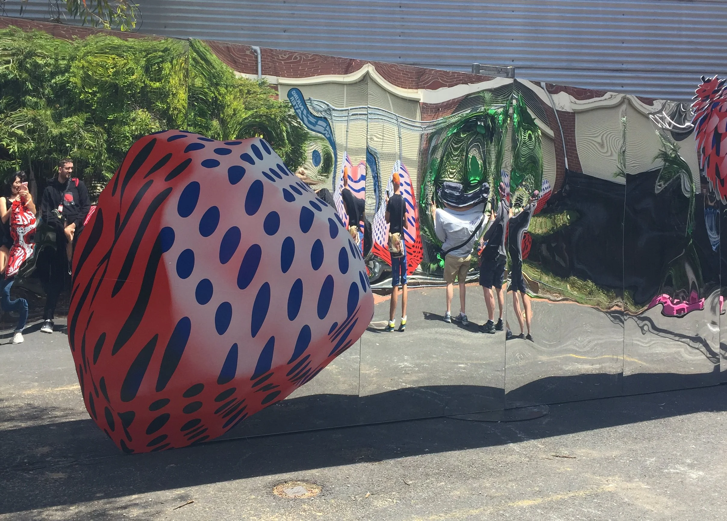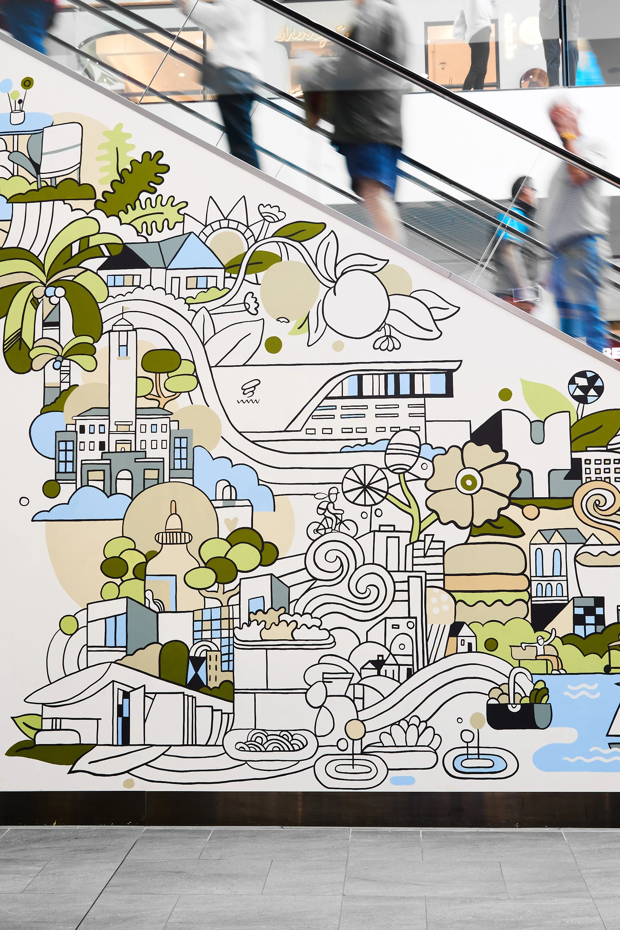Another mural that defied barriers of artist location and time, we worked with Vicinity Centre to find artists to create works for the newly renovated centre, The Glen. James Gulliver Hancock created this piece that reflected the landmarks and culture of the area, and the team at Weekdays Design painted it to perfection.