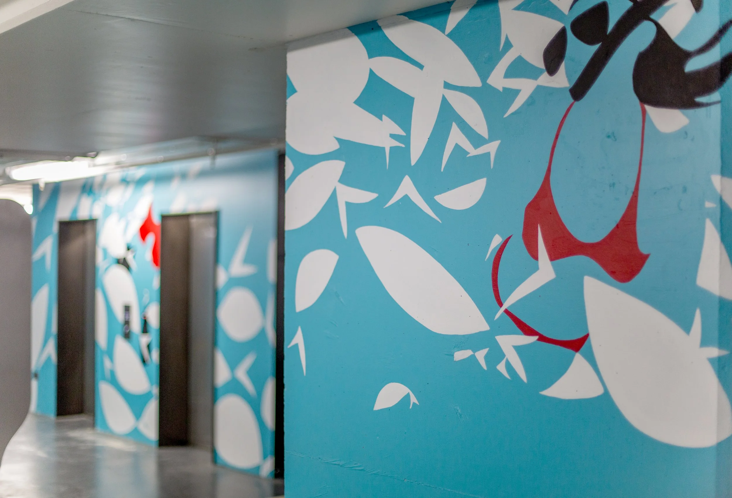 This multi-level car park had a canvas spanning three levels where artist, Clemens Habicht, wanted to reflect the beach culture of the area. The visuals slowly took you deeper into the ocean as you submerged from ground level. As the artist is based in Paris for half the year, the painting was skilfully executed by Will Lynes and his team after countless hours of working up the concepts to reflect the technical specifications from afar. This was the largest mural production we’d ever produced. Read more about it here.