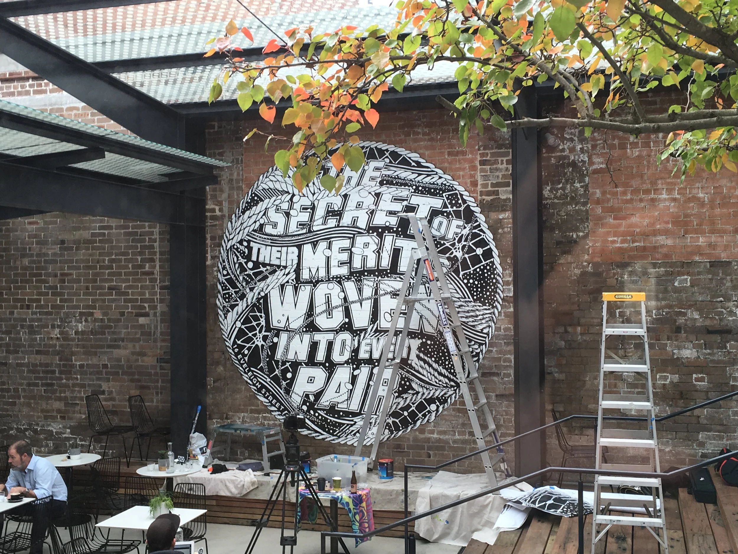 Illustration by Gemma O’Brien and carefully painted by the team at Lynes & Co on exposed, textured brick, this mural may not have happened! With the artist traveling, the surface being more difficult than a dry wall to paint on as well as other factors, a solution was proposed that could meet all the objectives. The mural can now be seen in the courtyard of the Frost* office in Redfern, Sydney, Australia.